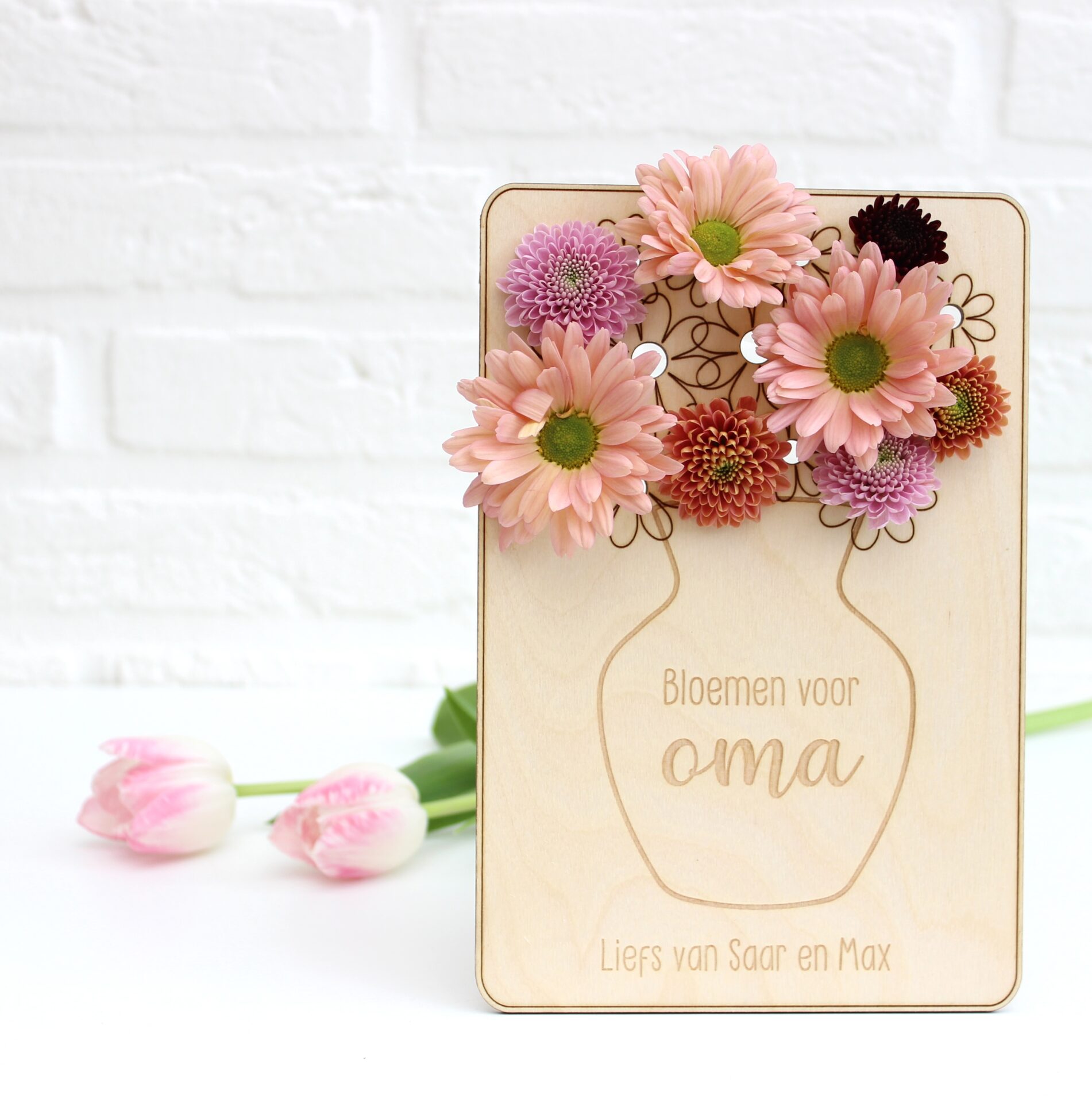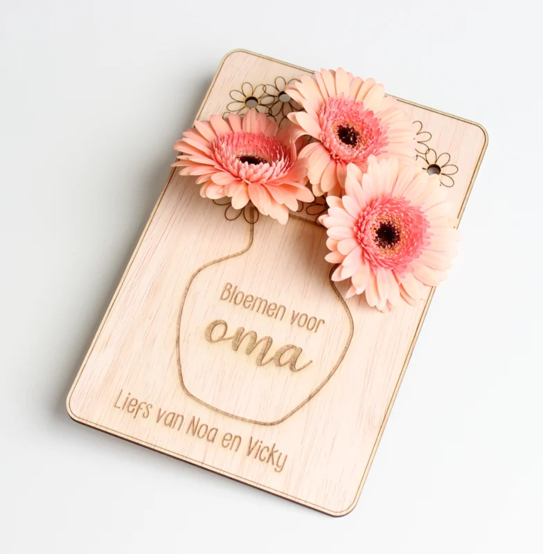 Met deze houten bloemenkaart maken kinderen zélf een boeket voor oma of mama.