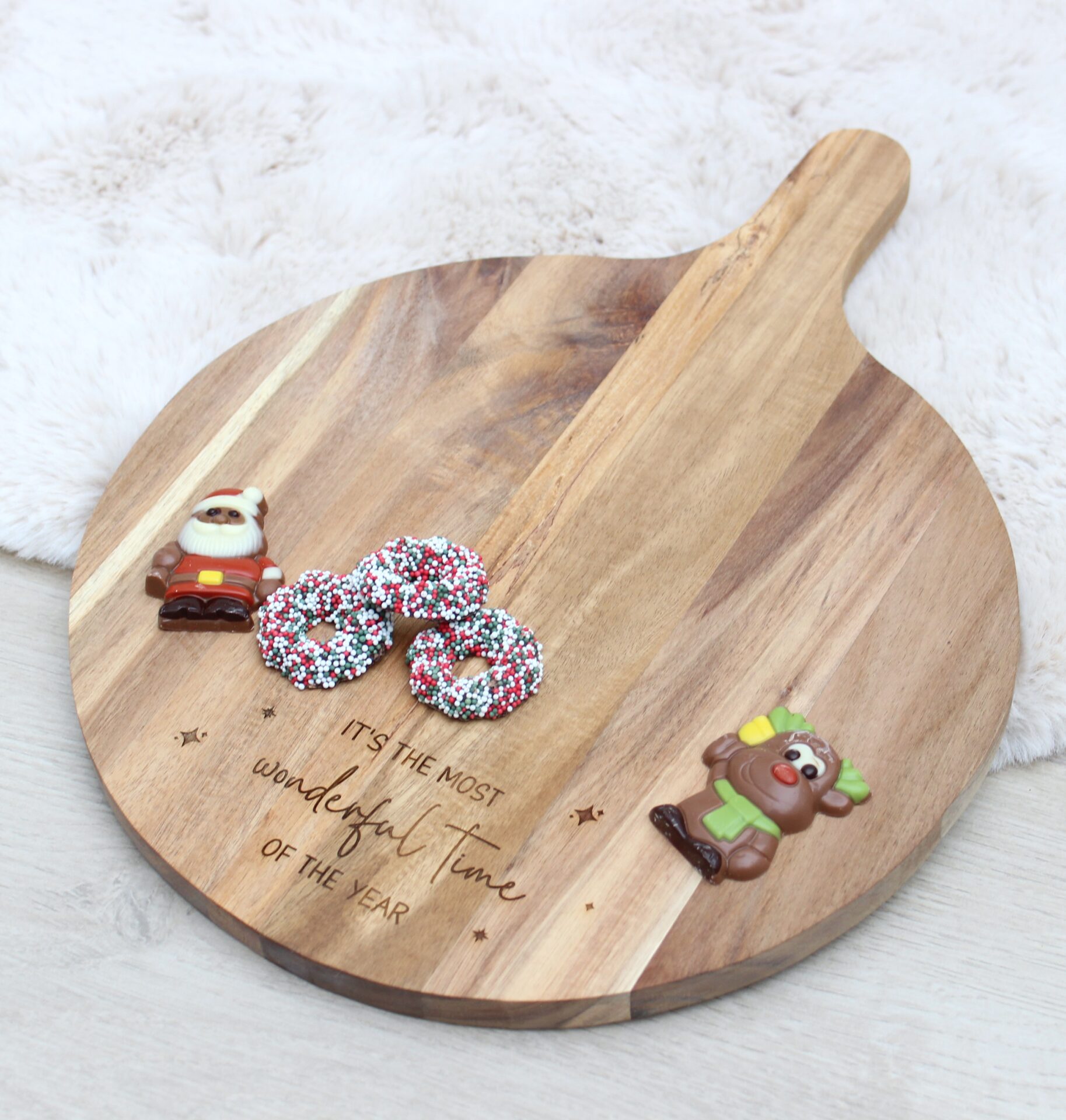 De plank is gemaakt van acaciahout en heeft een diameter van 30 cm (excl handvat). Een duurzaam Kerstcadeau dat je ieder jaar opnieuw kunt gebruiken.