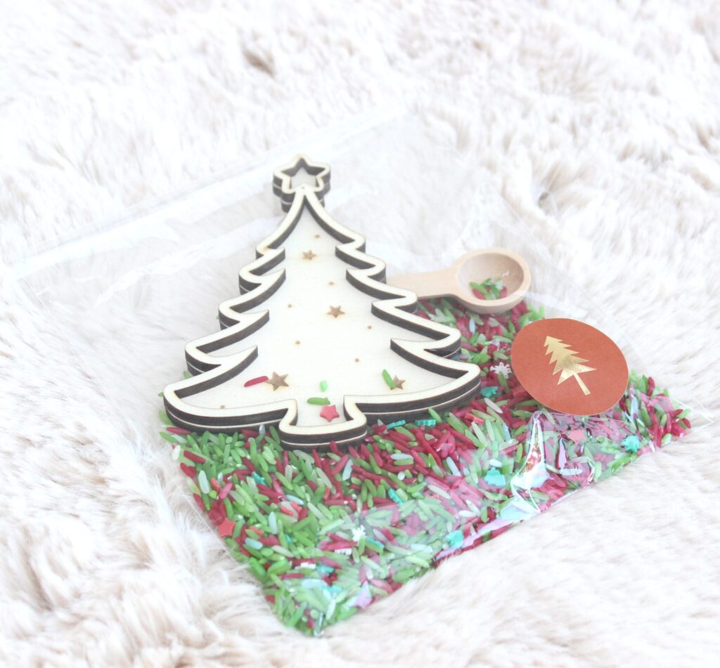 Zakje speelrijst met een mini schepje en een kerstboom-vulvormpje.