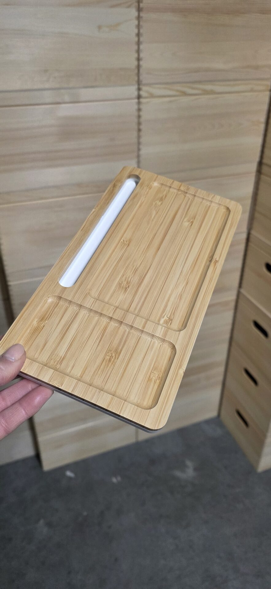 Draadloze bamboe oplader. Met ruimte voor een pen/potlood en notitieblaadjes.
