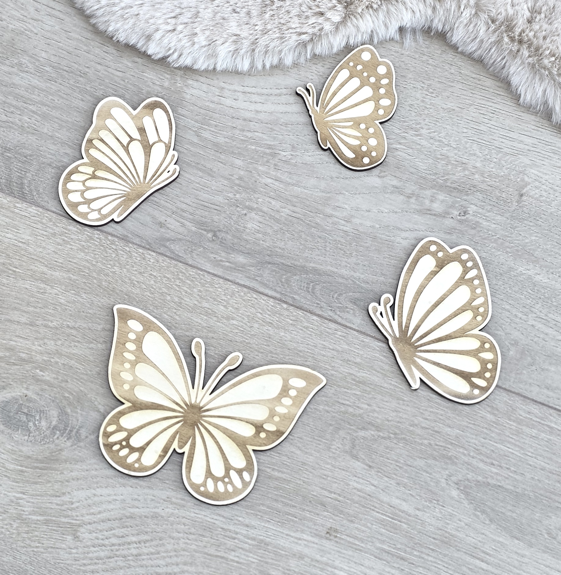 De set bestaat uit vier gegraveerde vlinders. De grootste vlinder is 10×15 cm. De vlinders zijn heel goed en mooi te combineren met een houten tekst of een houten naam.