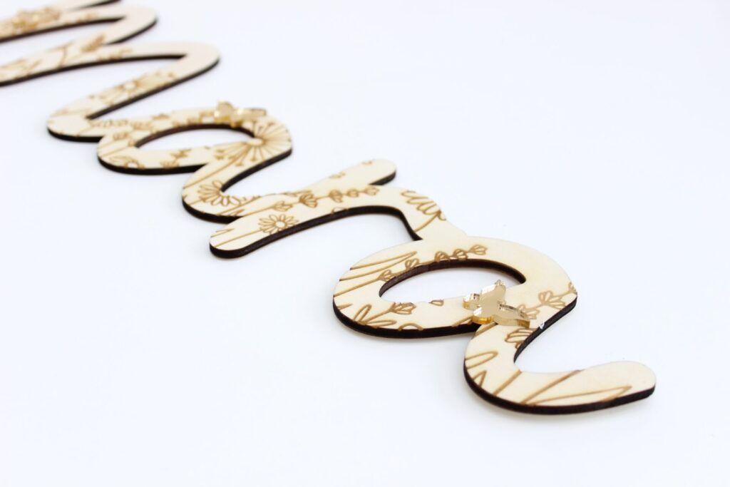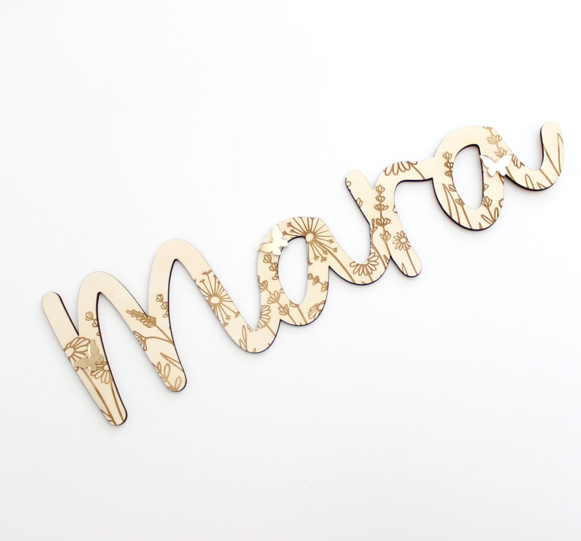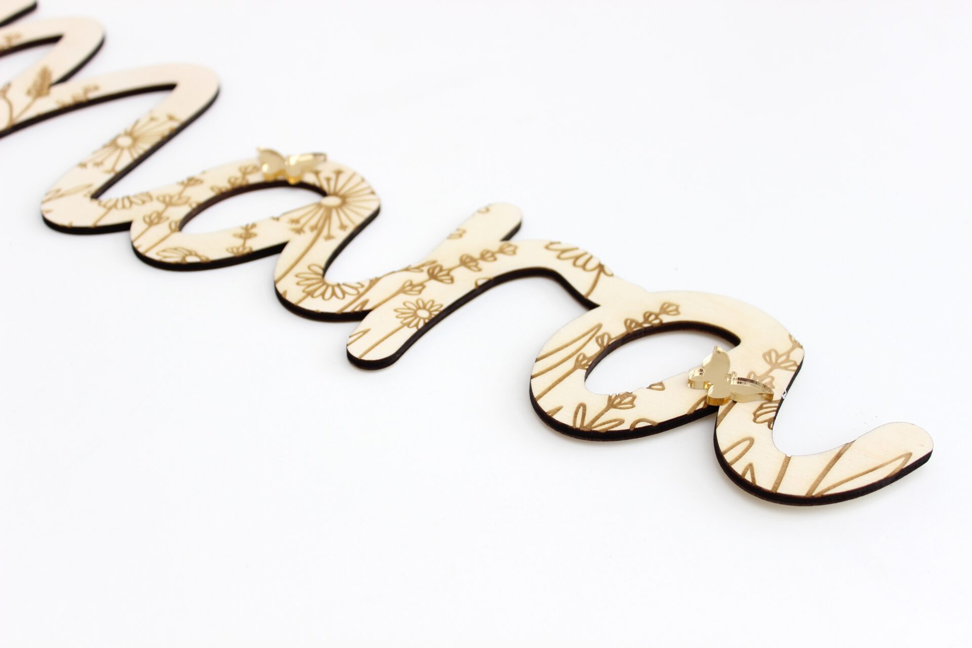 Een uniek decoratie aan de muur: een houten naam, gegraveerd met bloemetjes en versierd met gouden vlinders.