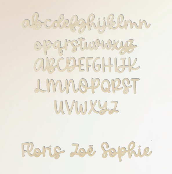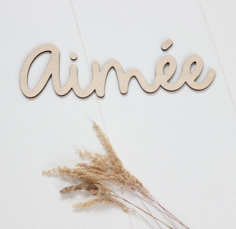 Een houten naam kun je op een deur, muur of meubelstuk hangen. Wanneer je geen lusletters naar beneden hebt, kun je de naam ook neerzetten.