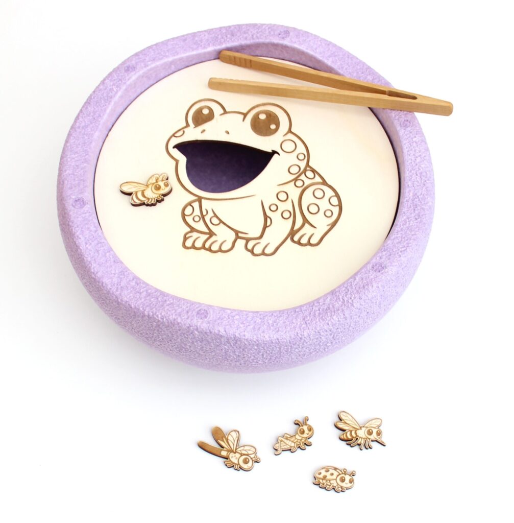 Geef de kikker insecten. Met de hand, of met een pincet. Beide zijn heel goed voor de pengreep en de fijne motoriek. Daarnaast is het goed voor de ontwikkeling van fantasie en rollenspel.