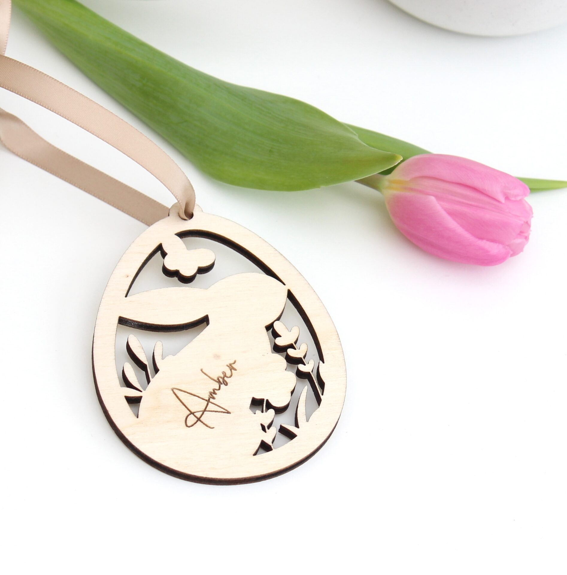 Het houten ei wordt voorzien van een gegraveerde naam. De hanger is ook geschikt voor namen met streepjes en puntjes.