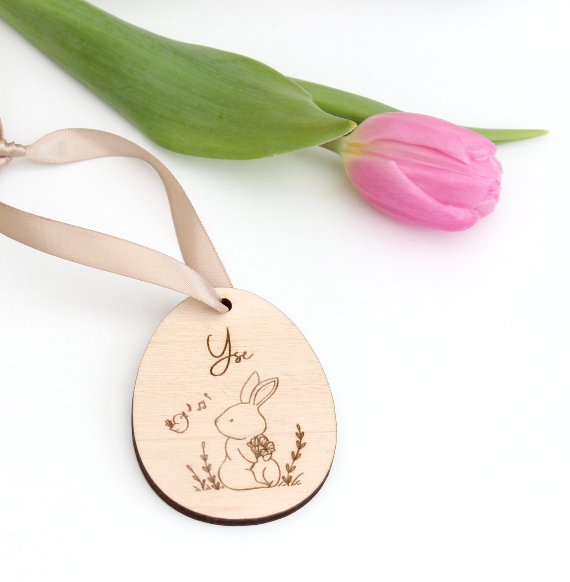 Het houten ei wordt voorzien van een naam. Het is ook geschikt voor namen met puntjes of streepjes.