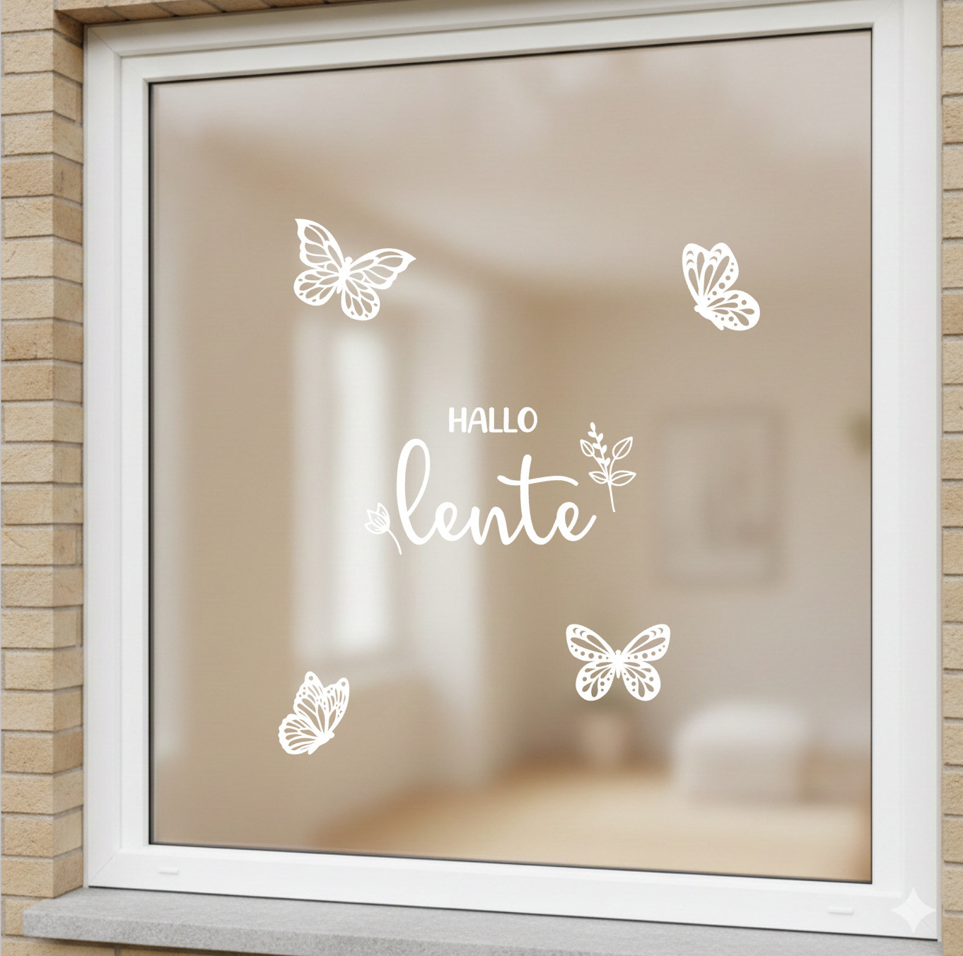 Deze set bestaat uit vier vlinder. De grootste vlinder is ongeveer 17 cm breed. Mooi om te combineren met andere raamstickers voor de lente of Pasen. Op de foto zie je de sticker gecombineerd met de tekst ‘Hallo lente’.