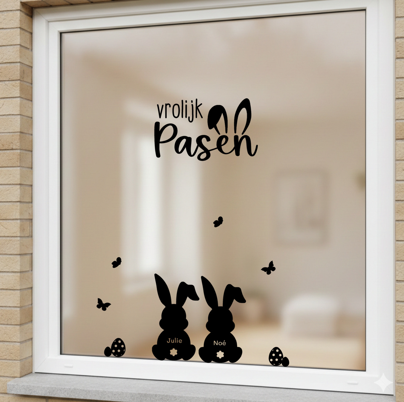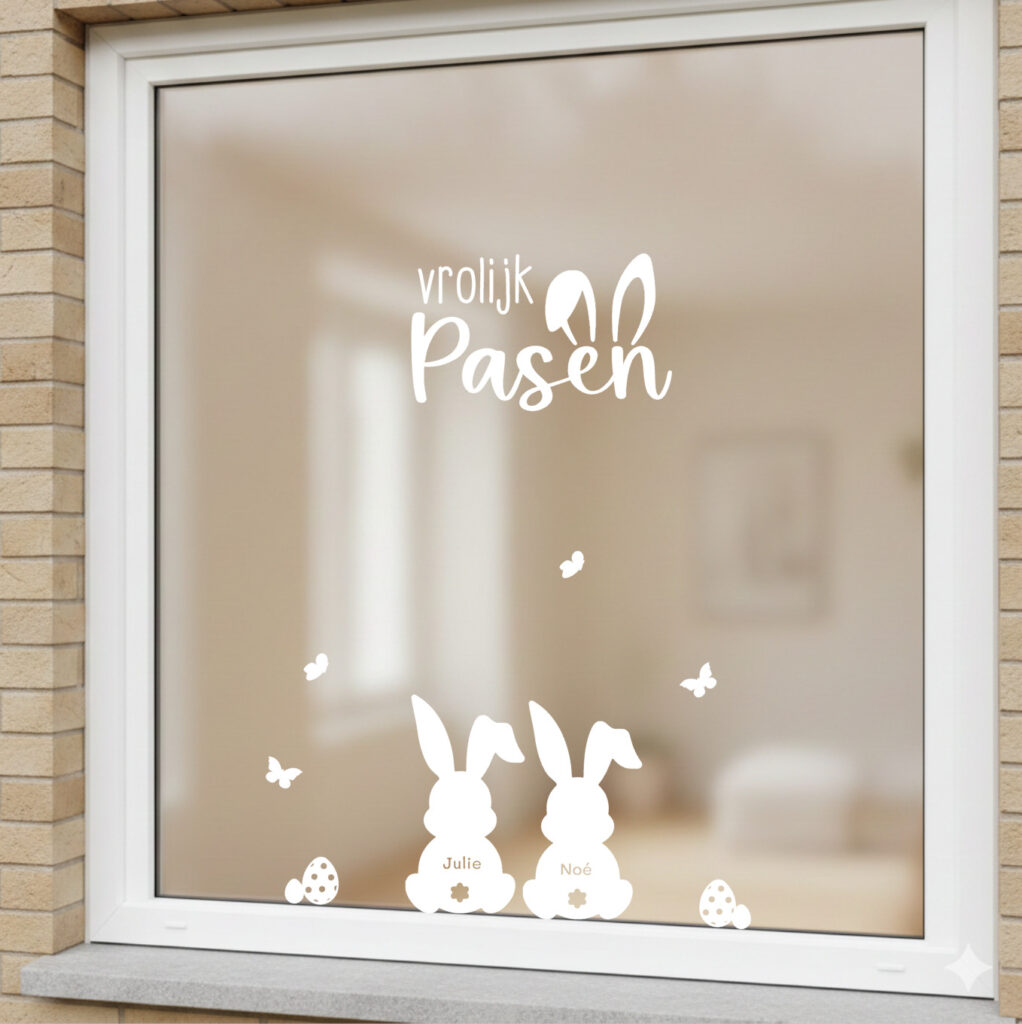 Deze set bestaat uit de tekst ‘Vrolijk Pasen’. Het woord ‘Pasen’ is ongeveer 30 cm breed. Mooi om te combineren met andere raamstickers voor de lente of Pasen. Op de foto zie je de sticker gecombineerd met konijntjes met naam.