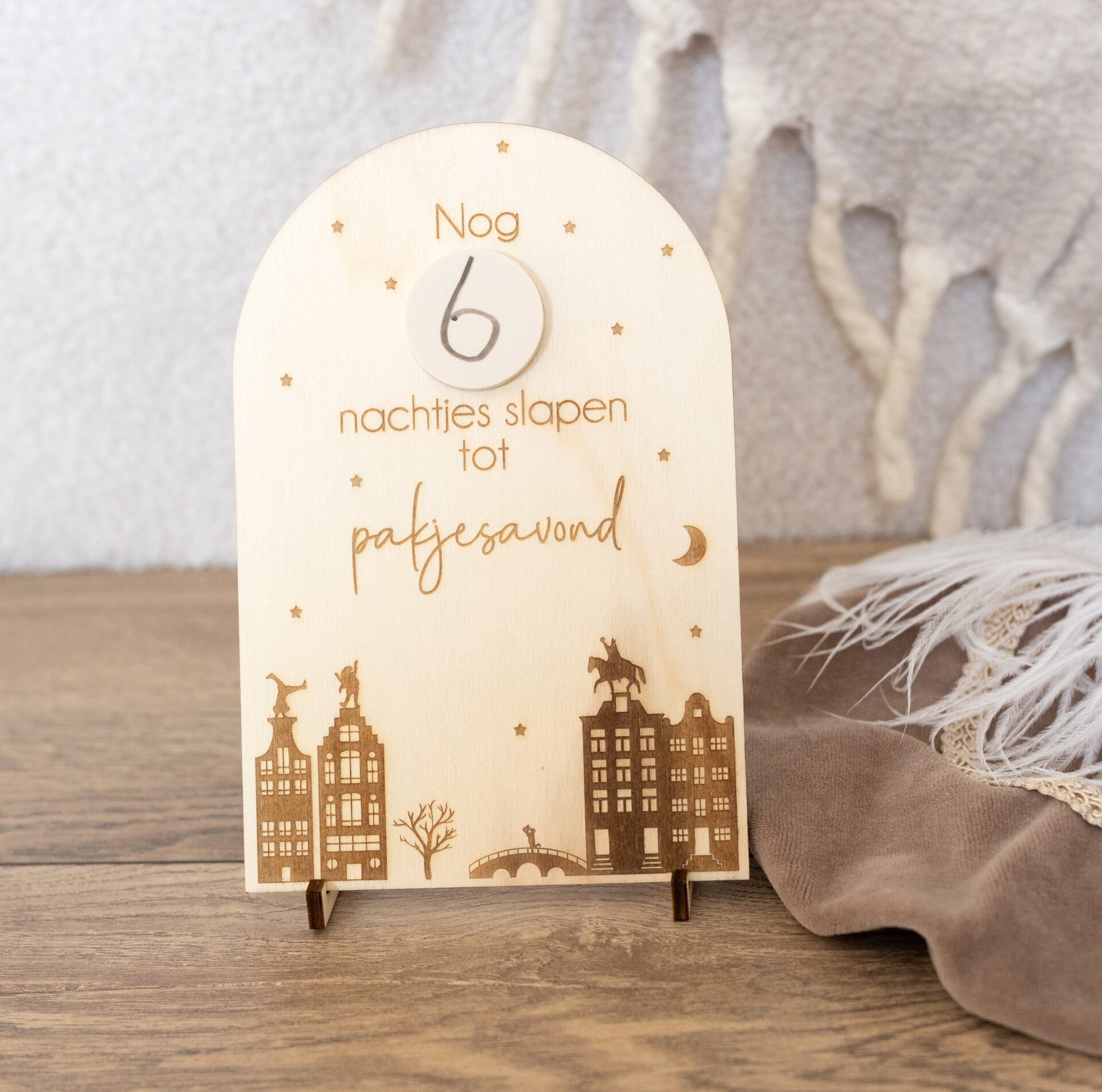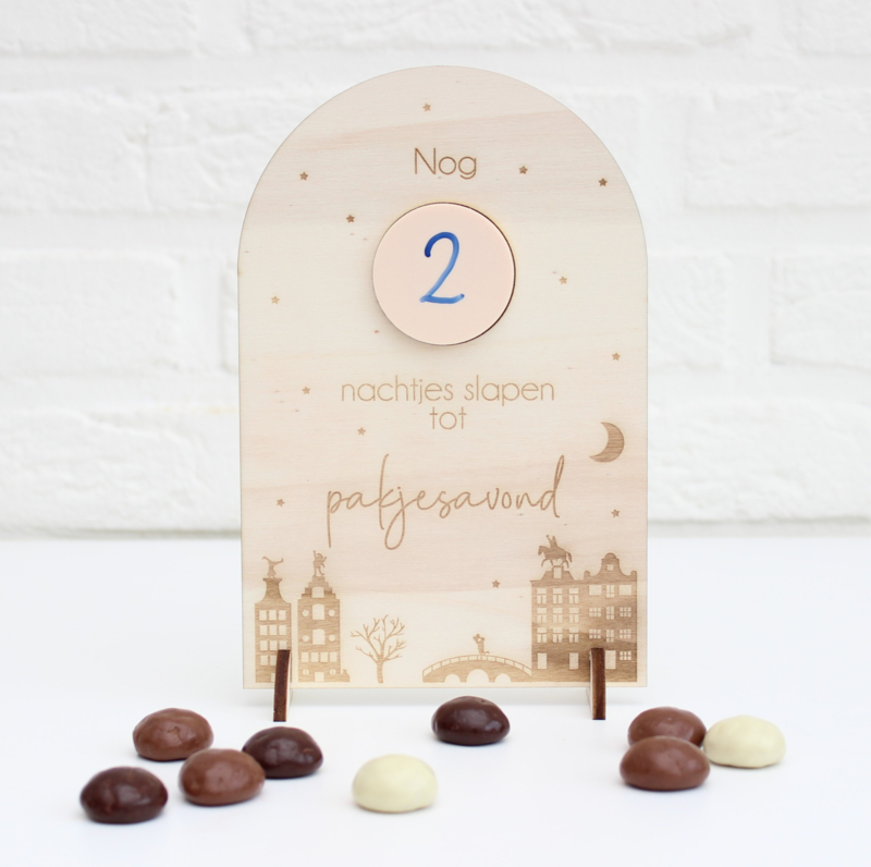 Op het bordje zit een wit rondje van acrylaat waarop je met een whiteboardstift kunt schrijven hoeveel nachtjes het nog duurt tot pakjesavond.